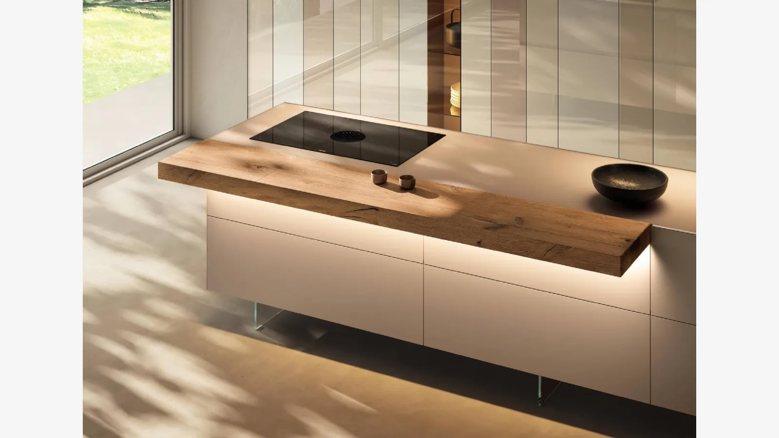 The beautiful Lago Design Kitchen with the 36e8 Cut Project 2824 glass island in the photo can be customized in multiple configurations, colors, and finishes of great aesthetic value. If you are a fan of design lines and do not compromise on quality, then our showroom is the right place for you. With Lago furnishing compositions, you can interpret the space with rationality, ensuring the practicality you need. Purchasing a Lago design kitchen allows for extensive customization: you can configure it according to your various practical and aesthetic needs. With the brand's Kitchen Designs with island, you can furnish spaces enriching their aesthetics.