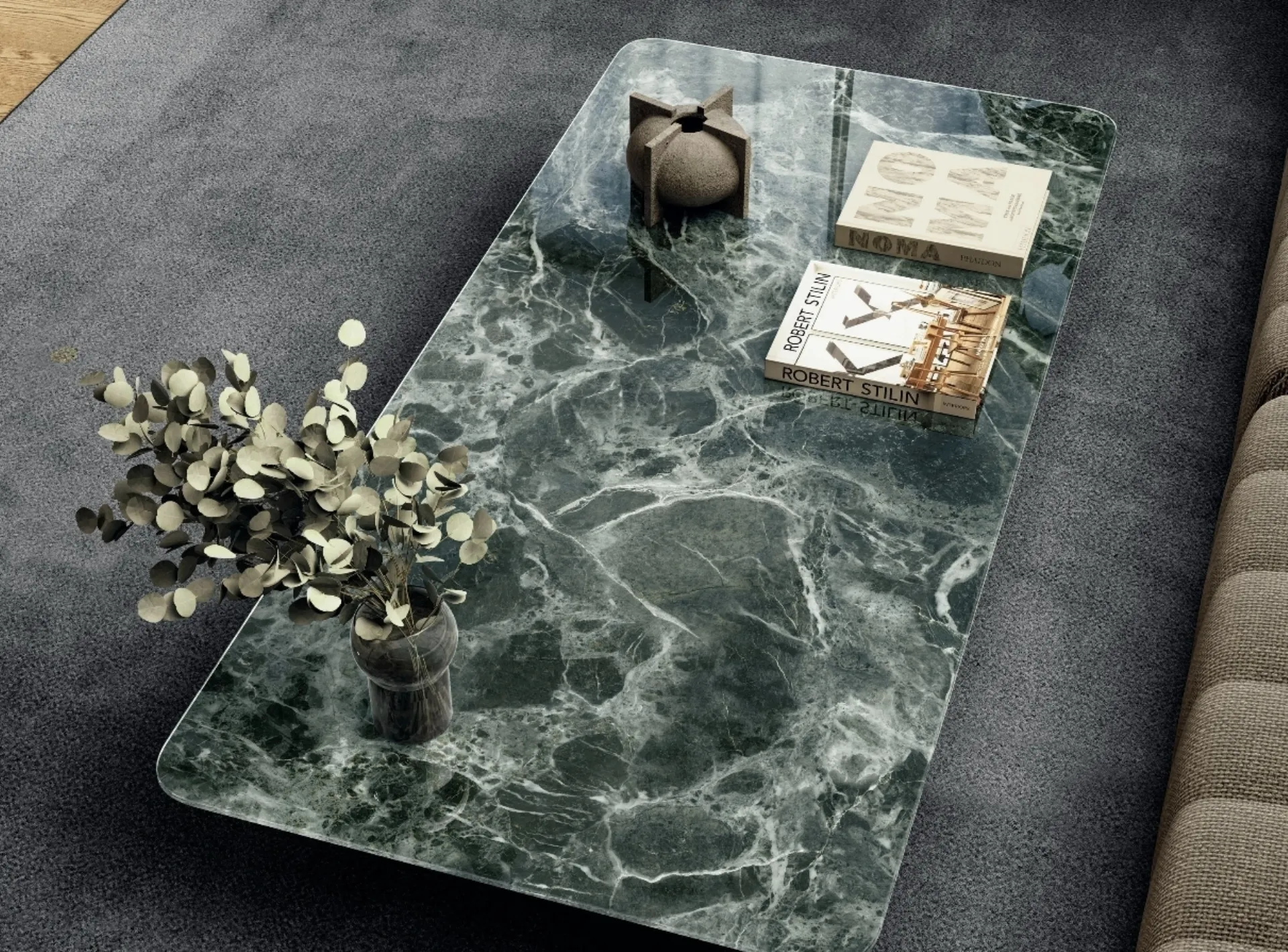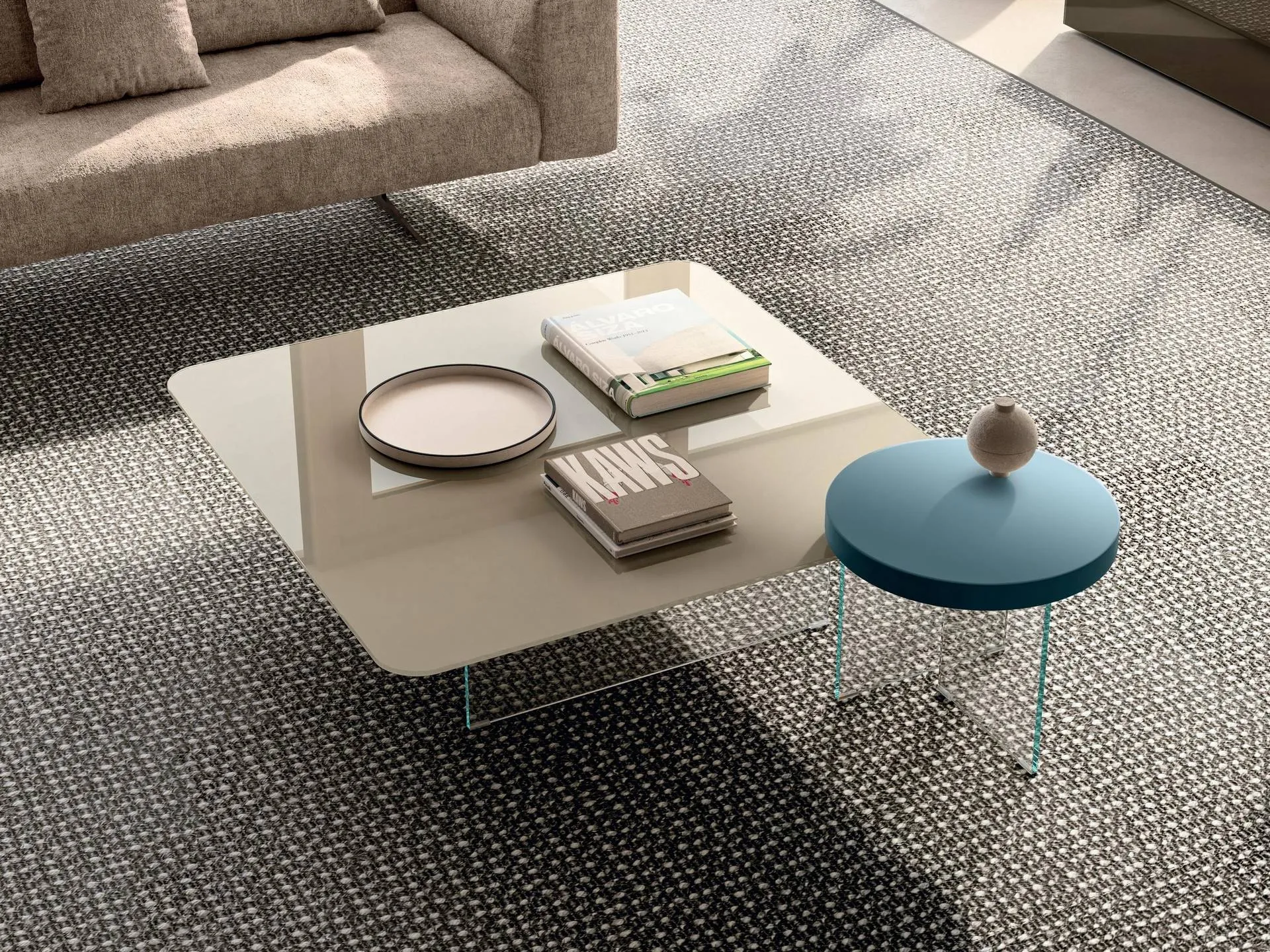 Air Soft 1955X - 1955G glass coffee table by Lago: it will add character and charm to an interior furnished with modern furniture and accessories. The high aesthetic value of Lago's furniture compositions enhance the living space with their colors and style, creating unique atmospheres. Accessories and coffee tables complete the home decor, occupying space in a useful and functional way while also adding beauty. In our showroom, you can experience the excellence of the brand's modern glass coffee table models firsthand, just like this one featured in the photo.
