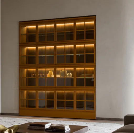 Floor-to-ceiling super functional wall libraries for modern rooms: discover more about the Wind Brown model with glass backs by Rimadesio brand!