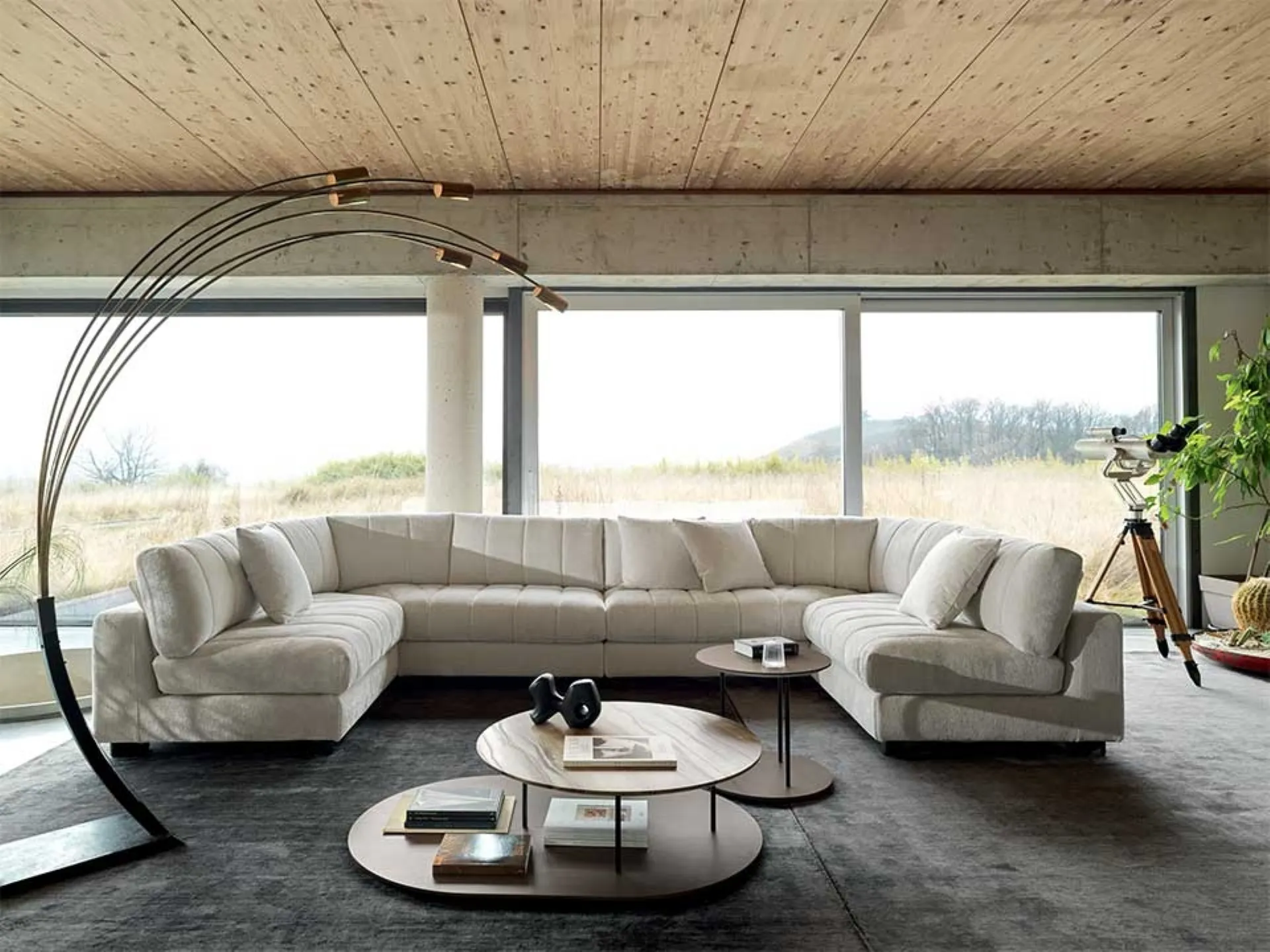 Our living rooms are designed to be paired with accessories of all kinds, such as coffee tables, lamps, and floor lamps, or in combination with additional fabric sofas. If you want sofas and armchairs with a peninsula like the model in the photo, characterized by volumes that invite you to spend your moments of rest. The Ditre Italia catalog offers various possibilities to enhance interiors in the name of functionality and aesthetic content, putting your comfort at the center. The brand's series of sofas offers various unique possibilities to enhance the living room in the name of functionality, comfort, and style.