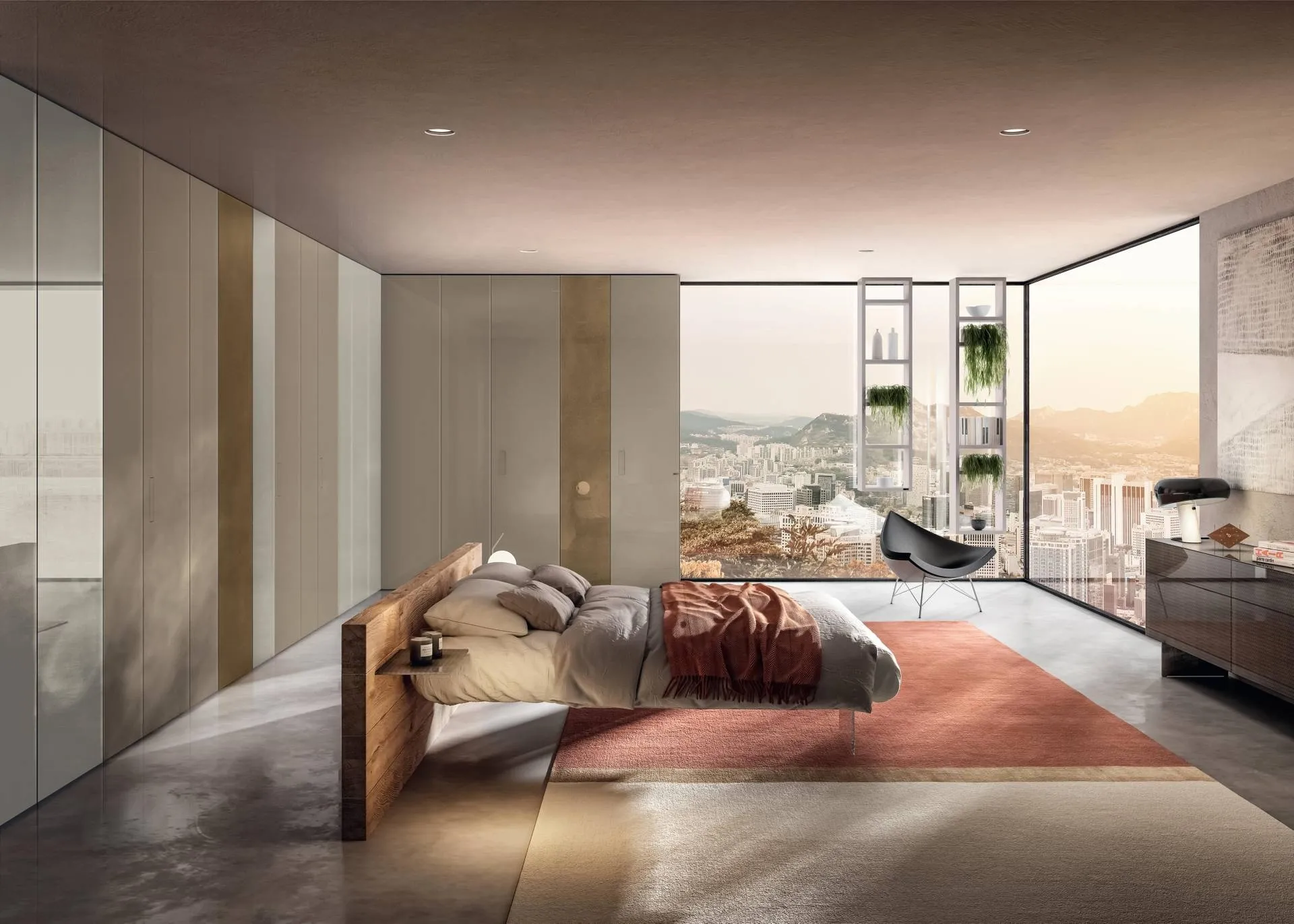 Lago's Flapp 1164 Corner Wardrobe : fill out the form to receive information of all kinds and advice on how to design the bedroom of your dreams. Corner wardrobes with hinged doors are essential components in the bedroom, to make it well-furnished, functional, and complete with everything. Contact us and find out more about our Home Furniture series: you will have the opportunity to complete the sleeping area with a rich offer of designer storage furniture, like the glass wardrobe in the picture.