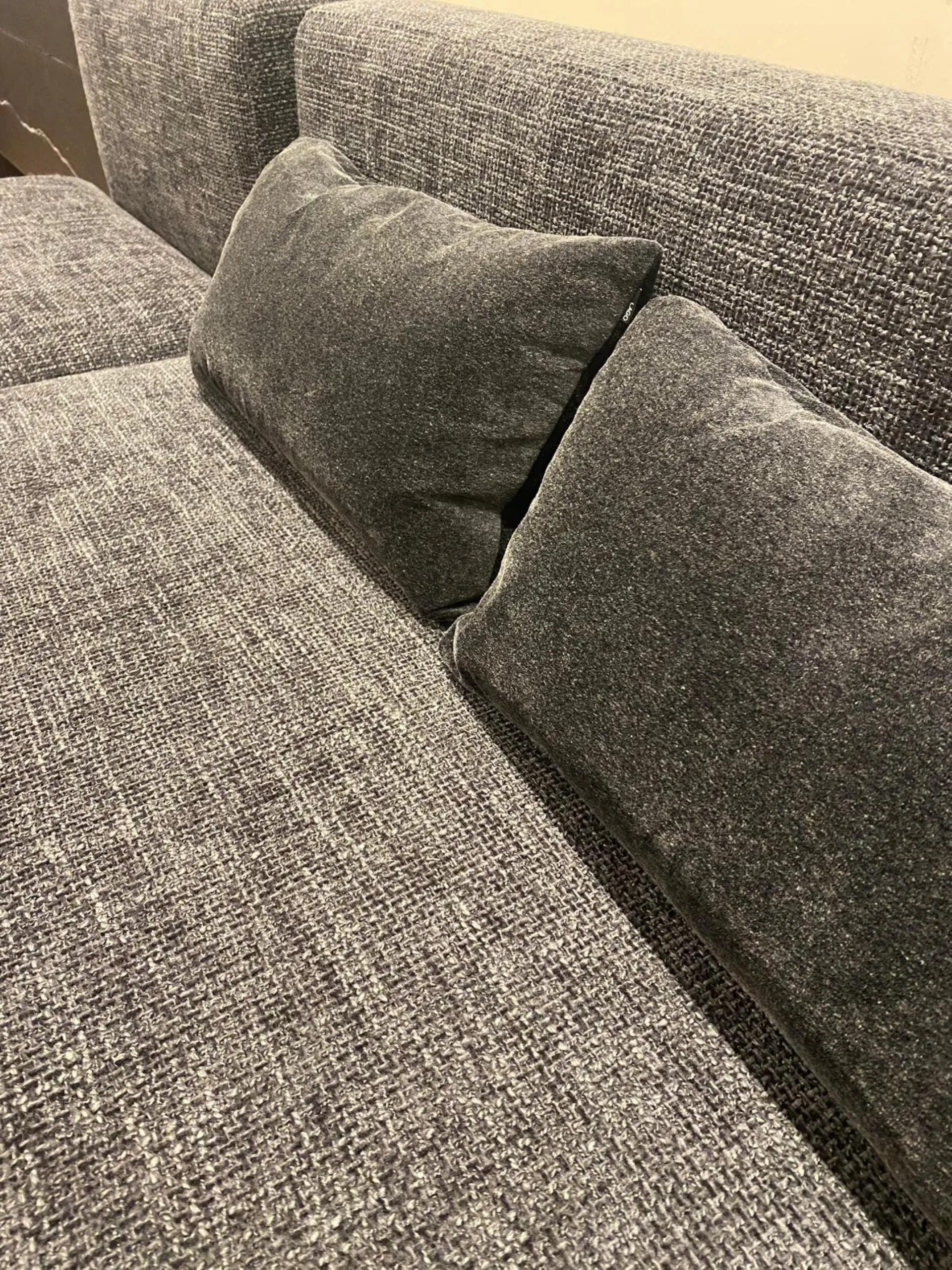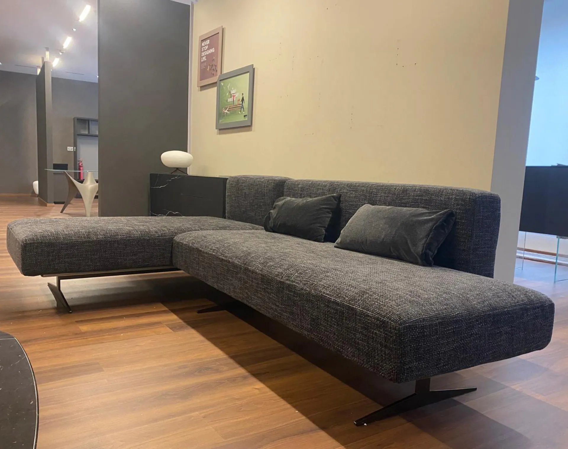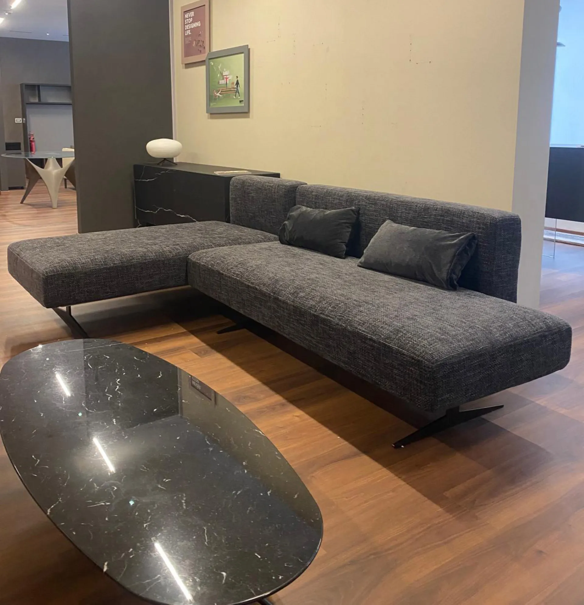 The Air sofa finds its true strength in modularity: depth of the seat, height of the backrest, different fabrics and colors shape the tailored sofa for every type of comfort and personality. Thanks to the patented hooking system, it is possible to create a unique sofa that, disassembled and reconfigured, can transform into three armchairs or two sofas, depending on how the frames, seats, backrests, and armrests are assembled. In addition to the legs in extra-clear tempered glass, the Air sofa can be supported by elegant metal braces. In both cases, the sofa represents a functional and comfortable solution that adds lightness to the environments in which it is placed. Dimensions: W.276 cm D.73.6/147.2 H.47/79 Materials: Steel mod. feet in pewter-colored painted metal; sofa covering in fabric cat.C art.Axum col.11 and free cushions in fabric cat.C art.Barkley col.1 All prices are already inclusive of VAT.